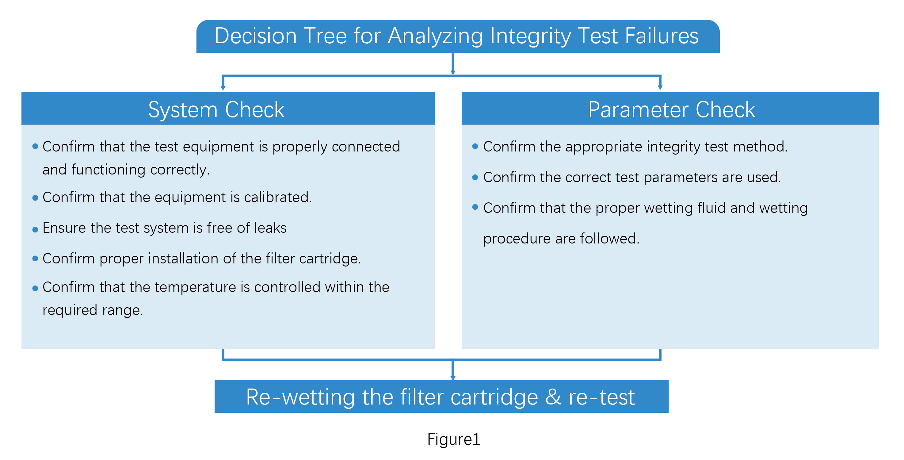 Proceed with troubleshooting according to Figure 1. If no issues are identified in the system and parameter checks, re-wet the filter cartridge and re-conduct the integrity test.