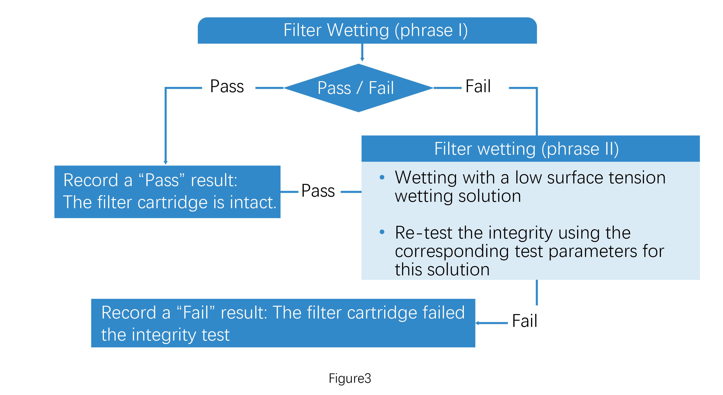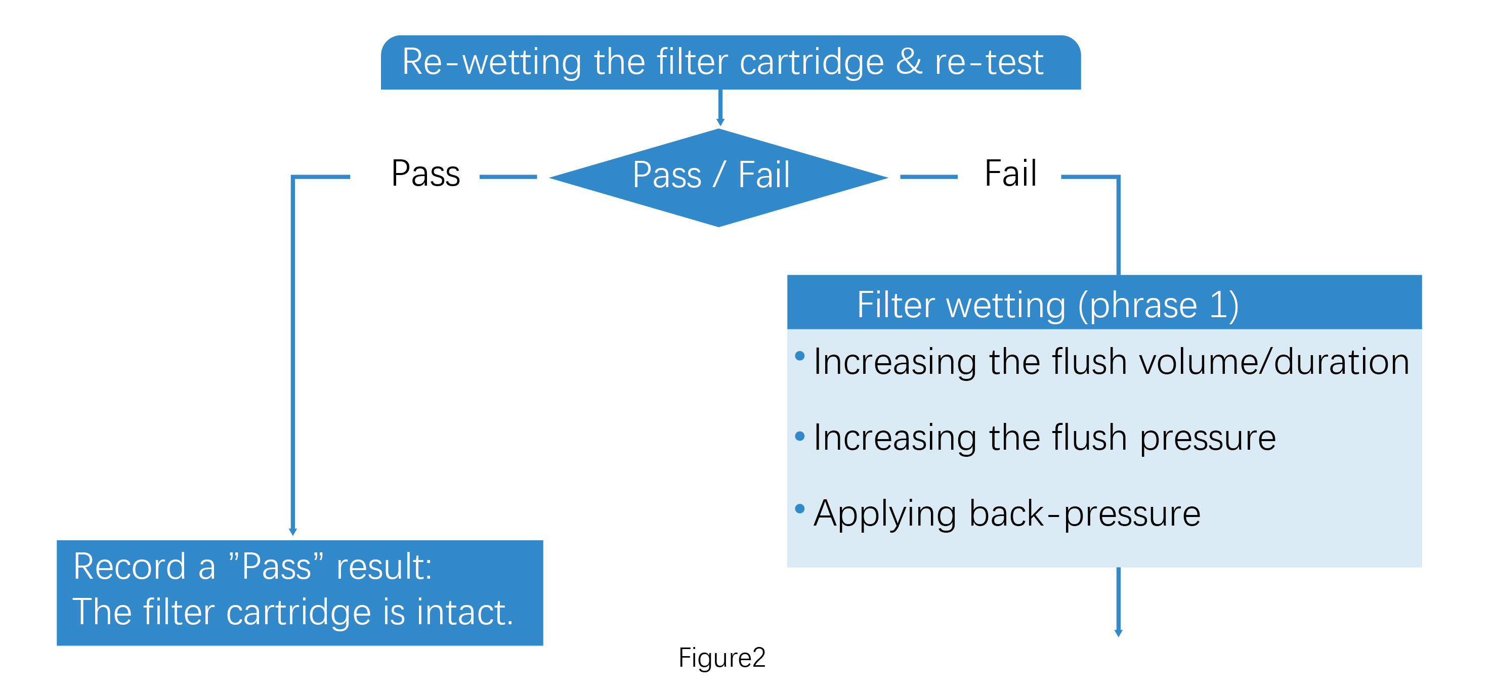 After following the troubleshooting steps in Figure 1, if the integrity test passes, record the filter cartridge as intact. If it fails, proceed with Figure 2. In this stage, further wetting of the filter cartridge can be attempted by increasing the flush volume/duration, increasing the flush pressure and applying back-pressure (Wetting Phase 1).
