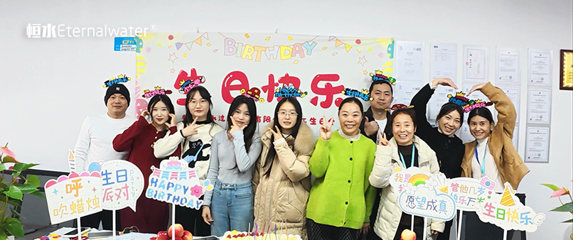 At 12 noon on December 25th, the activity hall on the fifth floor of the company was decorated particularly warmly. Colorful balloons were floating under the pale golden light. A tablecloth with the words "Happy Birthday" printed on it was spread on the long table, and flickering candles were placed on the big birthday cake. Here, the fourth quarter employee birthday party of Eternalwater Filtration Company was being held to celebrate the birthdays of more than ten colleagues whose birthdays were from October to December.